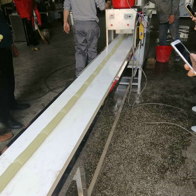 4、采用螺旋推料匀质装置,虾粉浆原料在向前推进过程中不断揉压匀质,熟化均匀彻底,虾棒成型好,外表光滑。