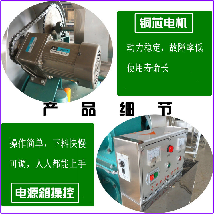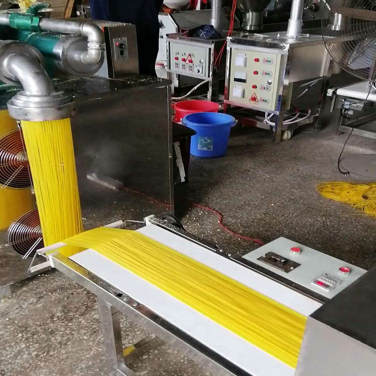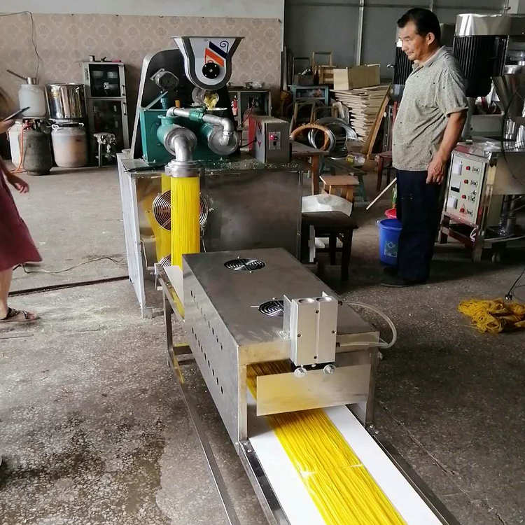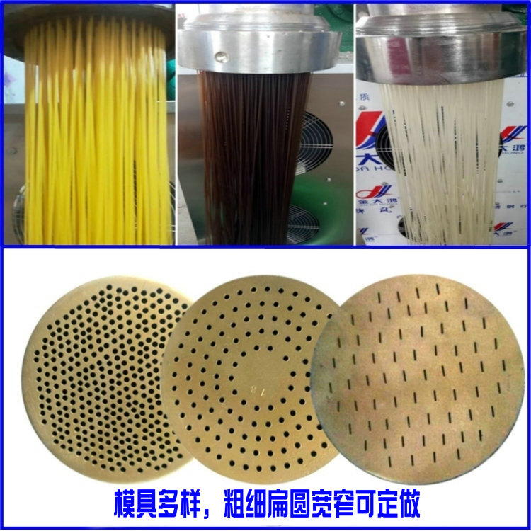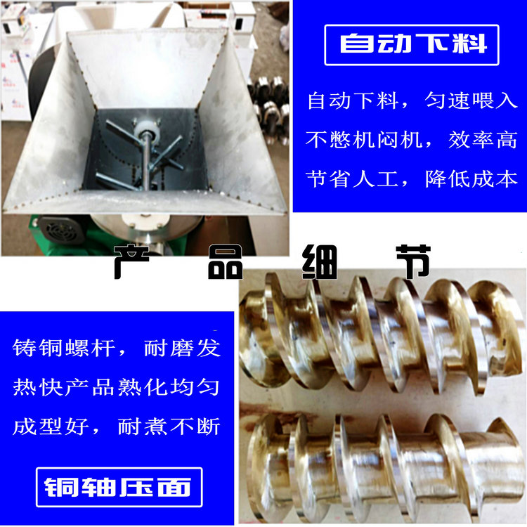 天华自熟冷面机(牛筋面机)结构合理,造型美观,由自动下料器、双铜轴压面机、数控切断机组成,自动下料器由调速电机带动,通过快慢速度调整喂料的多少,压面机采用螺旋挤压生物变性工艺,无需外加热源,利用轴筒旋转与原料摩擦揉挤产生的热能,使原料到成品一次熟化成型,将玉米面、荞麦面、小麦面等杂粮面通过冷面机综合转化成具有柔韧弹性特点的风味面食,更换不同的的模具可以加工不同粗细宽窄的形状,产品外表光滑、柔软可口、久煮不糊,保留原粮的特有营养成分和微量元素。自熟冷面机还可生产钢丝面、牛筋面及各种杂粮面条等。成型的面食进入调速皮带输送机,由延时控制切断装置把面条切成所需的长短后即可包装销售。